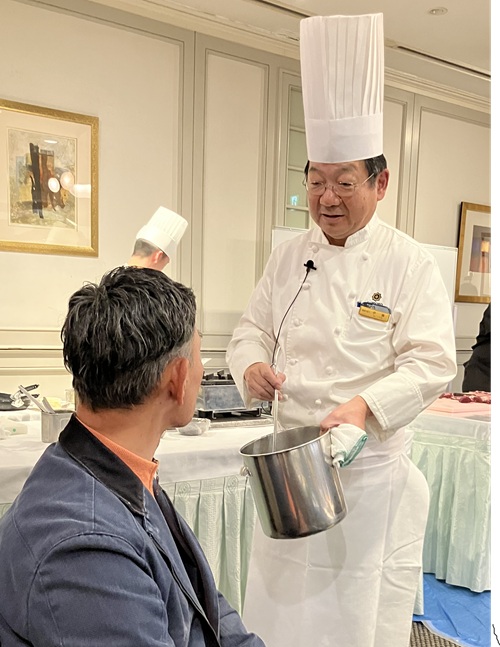 伊藤支部長は、絶品の「蝦夷鹿肉のコンソメ」、そして鹿肉と相性の良い「蝦夷鹿肉のメダイヨン、パン・デピスの香り ポワヴラードソースのポロシチ風味」の二品を披露されました。